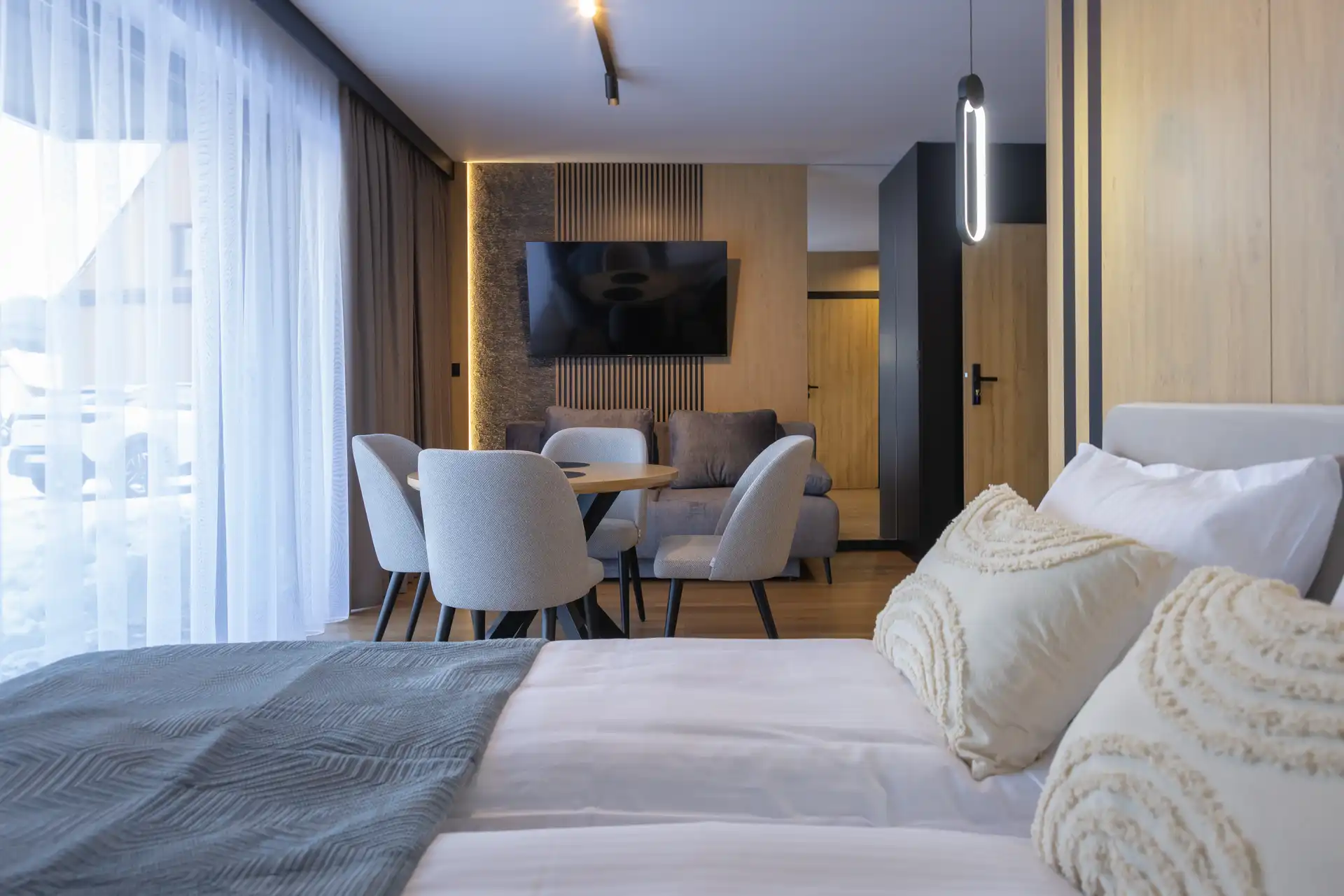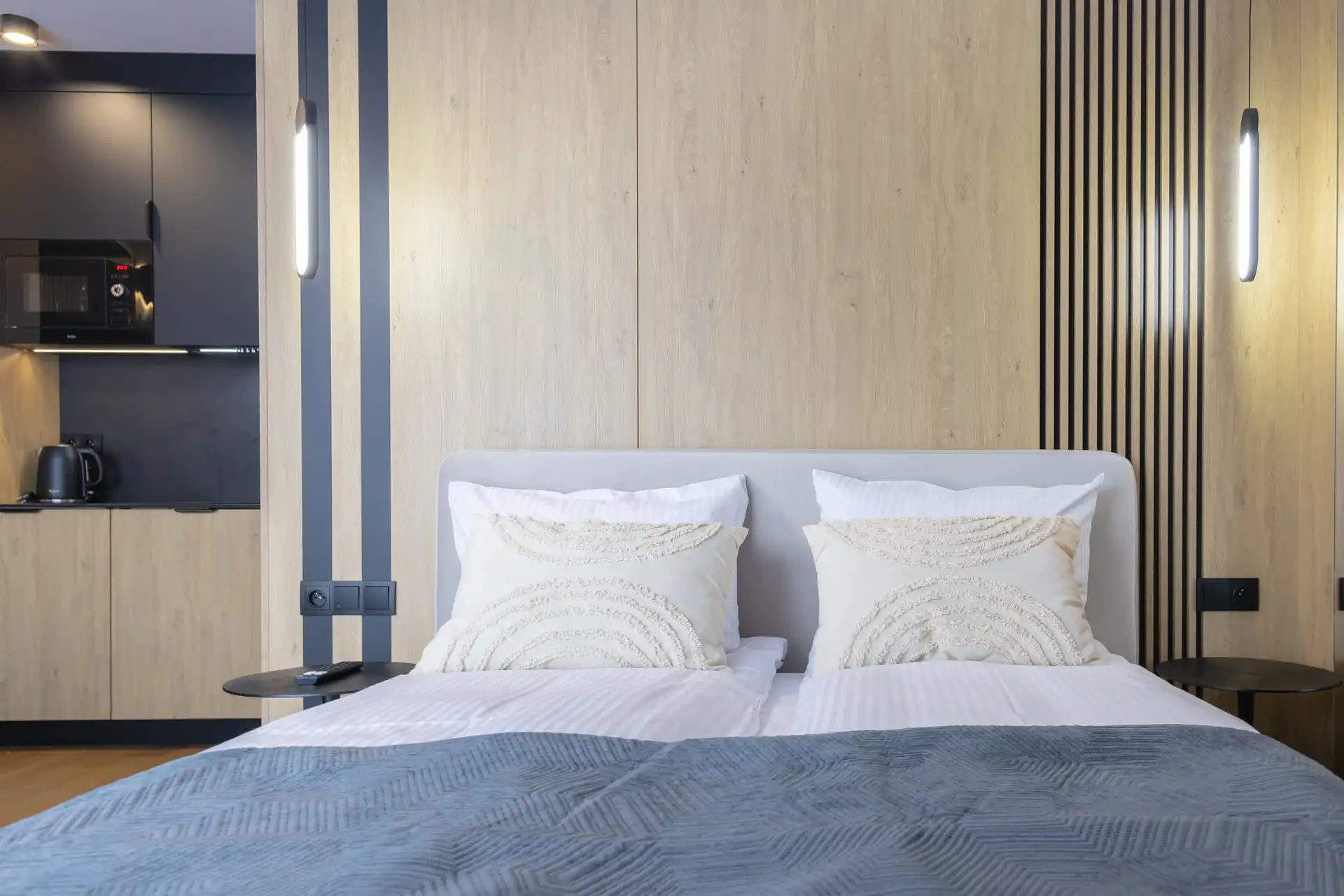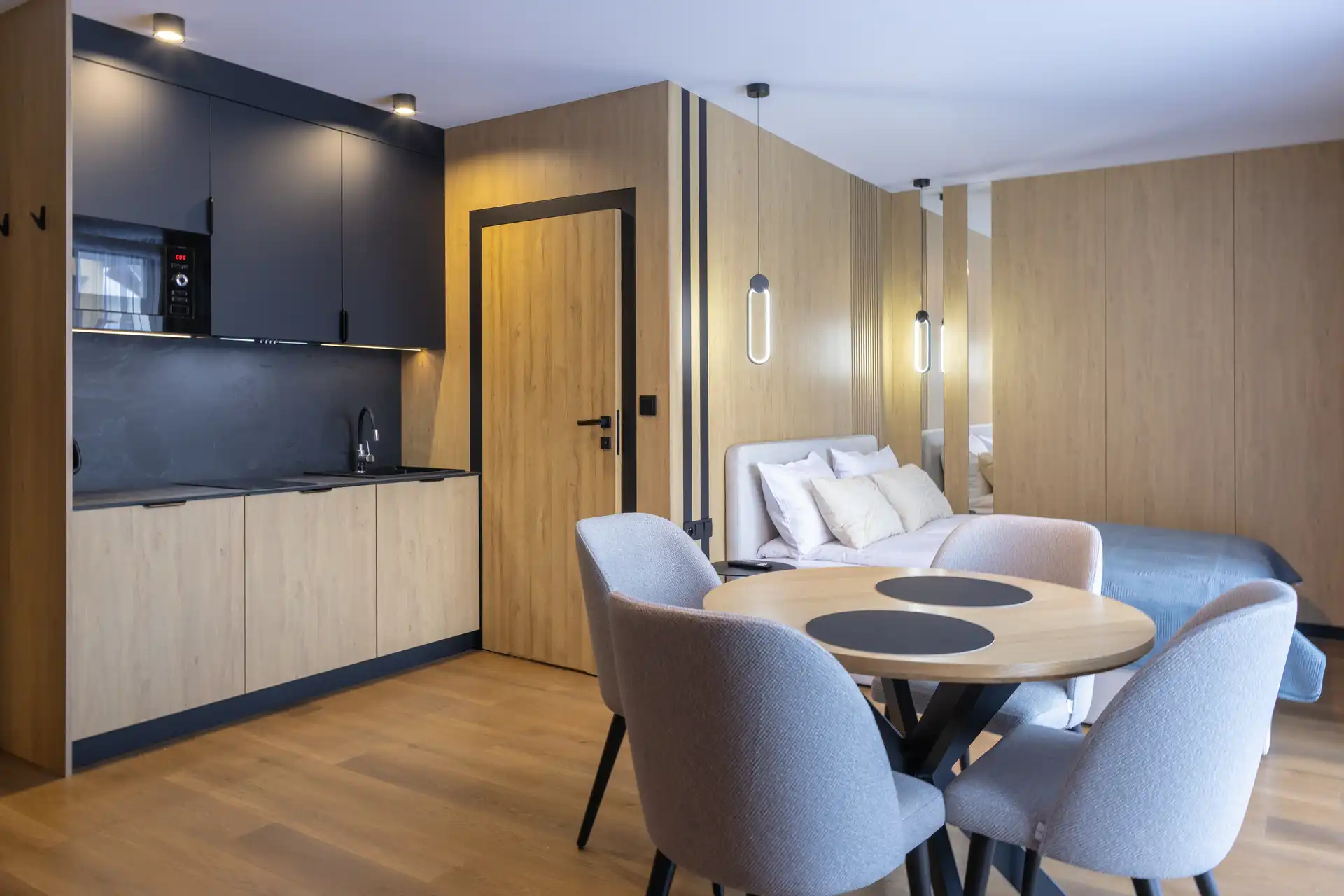 Każdy apartament to duża, świetnie wyposażona przestrzeń z aneksem kuchennym dla komfortu i wygody pobytu.